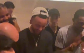 经典瞬间!库里做晚安安 身后的安东尼兴奋跳起成为背景