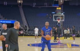 经典瞬间!库里做晚安安 身后的安东尼兴奋跳起成为背景