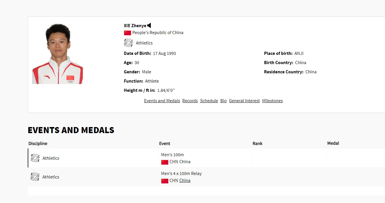 奥运会官网显示,男子200米首轮名单中也无谢震业。谢震业个人主页参赛项目仅有男子100米、4x100米接力,未显示主项男子200米项目。